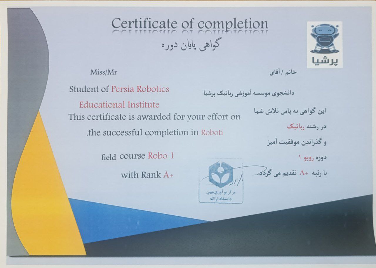 با افتخار اعلام میکنیم که این مجموعه با همکاری دانشگاه اراک، یکی از معتبرترین دانشگاههای ایران، اقدام به اعطای مدرک بینالمللی در حوزههای رباتیک و برنامهنویسی میکند. این مدرک به عنوان سندی معتبر و قابل استناد، نشاندهنده مهارتها و دانش تخصصی شما در این زمینههای پیشرفته فناوری است.